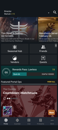 The Destiny Companion App is a mobile app available on iOS, Android, and web browsers. The companion app gives players access to a variety of game-related functions, and can view and adjust their own game setups remotely. It was initially released on July 17, 2014 alongside the Destiny Beta[1], but has changed heavily across time.