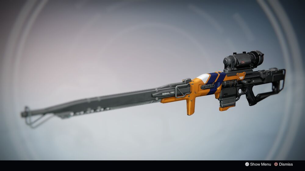 This image is a screenshot of a weapon from the Destiny series of first-person shooter video games developed by Bungie Studios and published by Bungie or Activision. It falls under the screenshot category for a copyrighted computer game or video game, and the copyright for it is most likely held by the company that developed the game. It is believed that the use of a limited number of web-resolution screenshots: