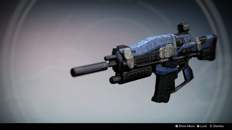 This image is a screenshot of a weapon from the Destiny series of first-person shooter video games developed by Bungie Studios and published by Bungie or Activision. It falls under the screenshot category for a copyrighted computer game or video game, and the copyright for it is most likely held by the company that developed the game. It is believed that the use of a limited number of web-resolution screenshots: