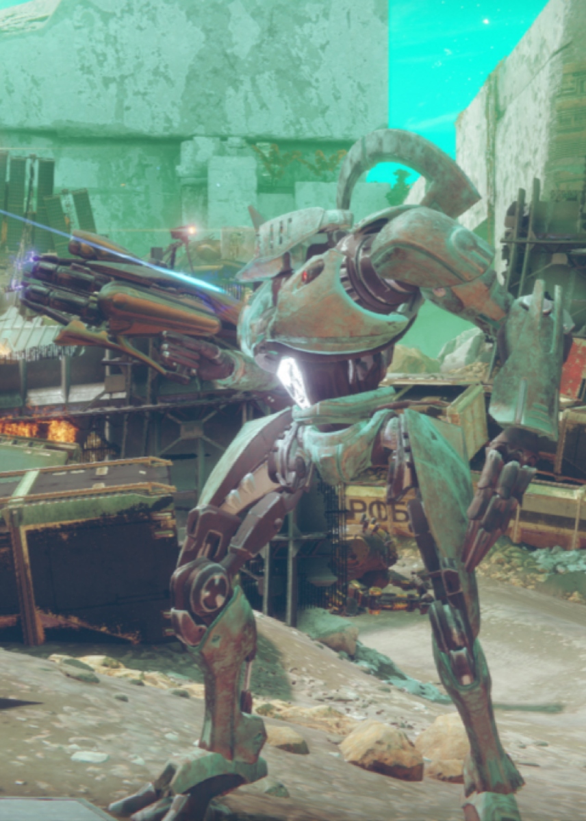 This image is a screenshot of a character or AI unit from the Destiny series of first-person shooter video games developed by Bungie Studios and published by Bungie or Activision. It falls under the screenshot category for a copyrighted computer game or video game, and the copyright for it is most likely held by the company that developed the game. It is believed that the use of a limited number of web-resolution screenshots: