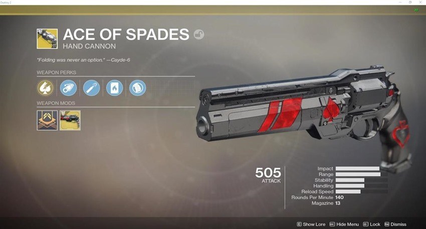 This image is a screenshot of a weapon from the Destiny series of first-person shooter video games developed by Bungie Studios and published by Bungie or Activision. It falls under the screenshot category for a copyrighted computer game or video game, and the copyright for it is most likely held by the company that developed the game. It is believed that the use of a limited number of web-resolution screenshots: