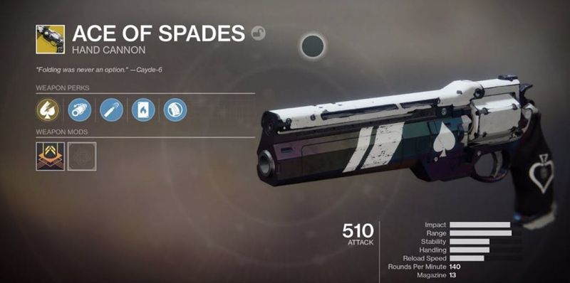 This image is a screenshot of a weapon from the Destiny series of first-person shooter video games developed by Bungie Studios and published by Bungie or Activision. It falls under the screenshot category for a copyrighted computer game or video game, and the copyright for it is most likely held by the company that developed the game. It is believed that the use of a limited number of web-resolution screenshots: