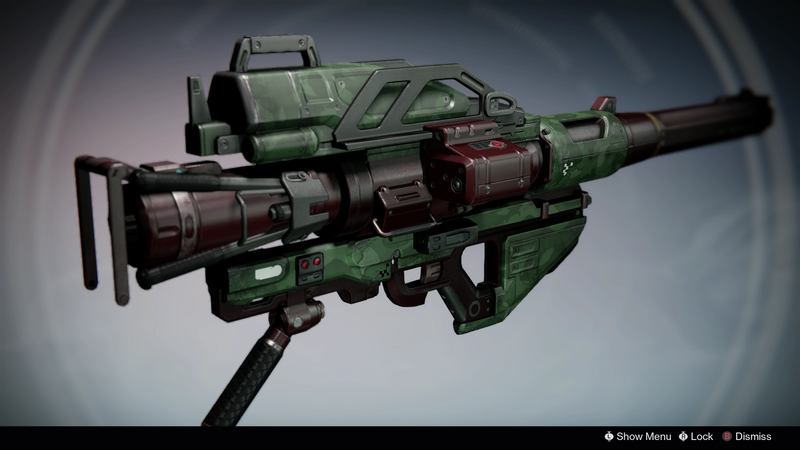 This image is a screenshot of a weapon from the Destiny series of first-person shooter video games developed by Bungie Studios and published by Bungie or Activision. It falls under the screenshot category for a copyrighted computer game or video game, and the copyright for it is most likely held by the company that developed the game. It is believed that the use of a limited number of web-resolution screenshots: