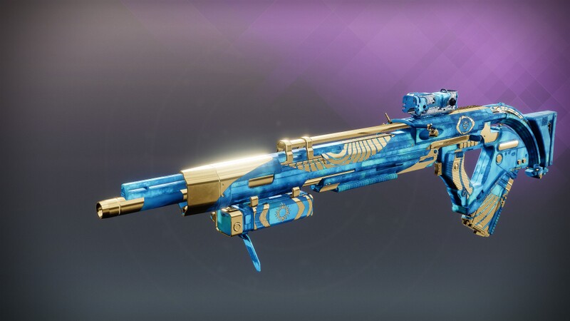 This image is a screenshot of a weapon from the Destiny series of first-person shooter video games developed by Bungie Studios and published by Bungie or Activision. It falls under the screenshot category for a copyrighted computer game or video game, and the copyright for it is most likely held by the company that developed the game. It is believed that the use of a limited number of web-resolution screenshots: