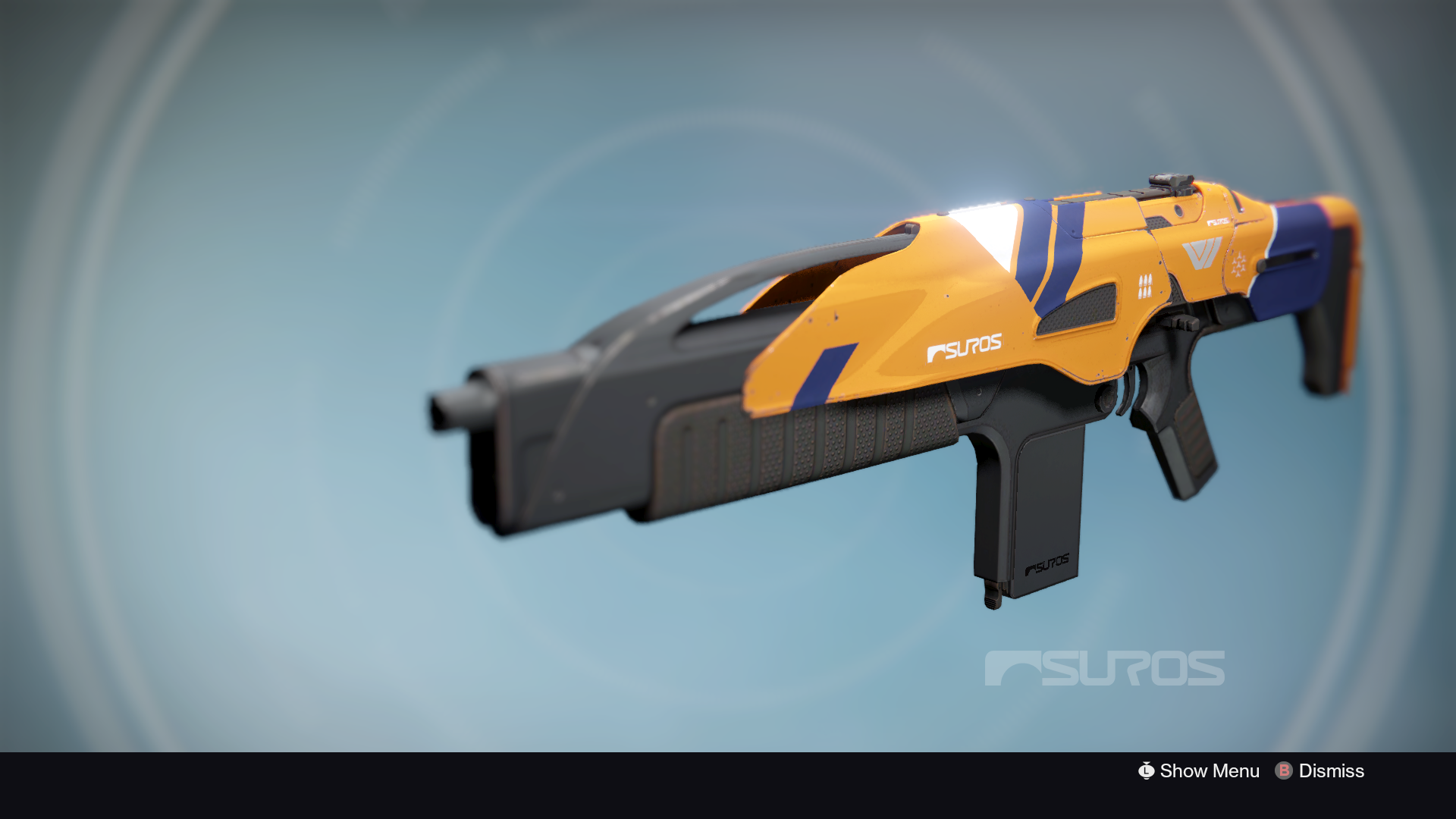 This image is a screenshot of a weapon from the Destiny series of first-person shooter video games developed by Bungie Studios and published by Bungie or Activision. It falls under the screenshot category for a copyrighted computer game or video game, and the copyright for it is most likely held by the company that developed the game. It is believed that the use of a limited number of web-resolution screenshots: