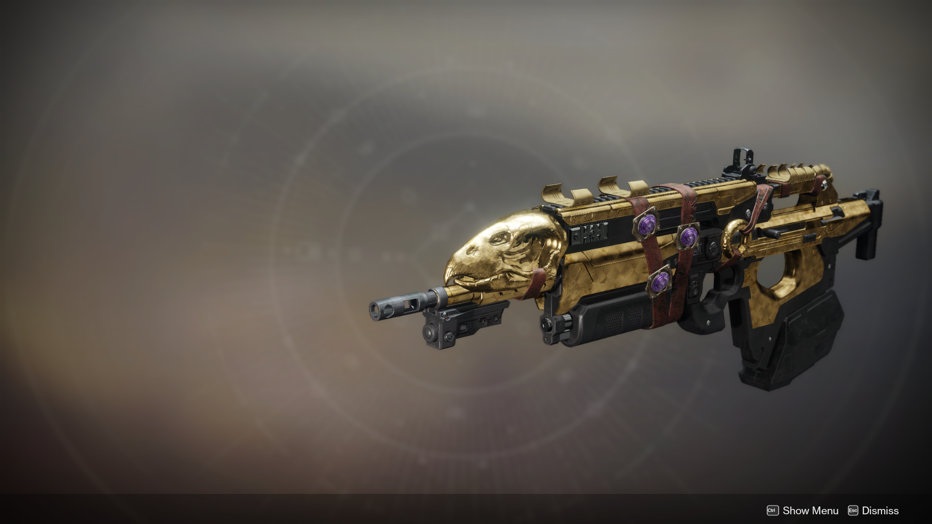 | 16:49, August 24, 2019 | 1,919 × 1,079 (1.47 MB) | OtySquad (talk | contribs) | The Exotic Weapon, "Bad Juju", with the Exotic Ornament, "Aurelian Decree", without any text for easier viewing. |