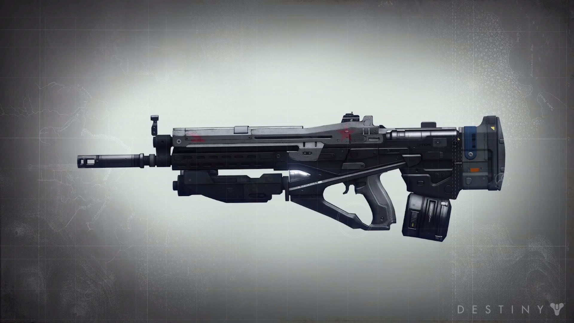 This image is a screenshot of a weapon from the Destiny series of first-person shooter video games developed by Bungie Studios and published by Bungie or Activision. It falls under the screenshot category for a copyrighted computer game or video game, and the copyright for it is most likely held by the company that developed the game. It is believed that the use of a limited number of web-resolution screenshots: