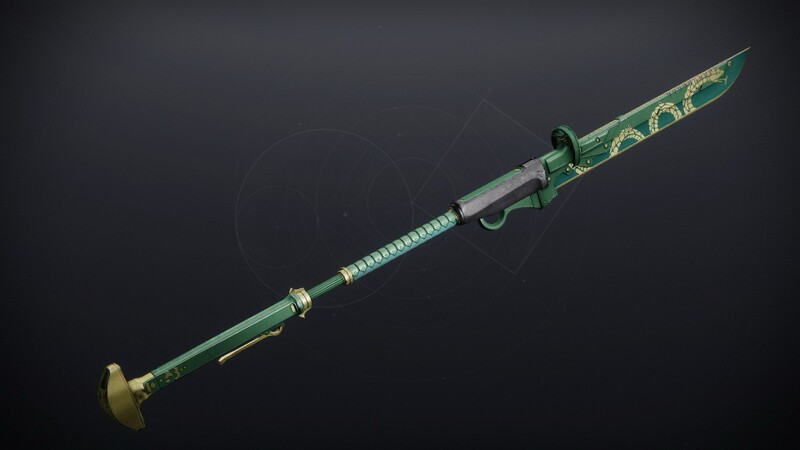This image is a screenshot of a weapon from the Destiny series of first-person shooter video games developed by Bungie Studios and published by Bungie or Activision. It falls under the screenshot category for a copyrighted computer game or video game, and the copyright for it is most likely held by the company that developed the game. It is believed that the use of a limited number of web-resolution screenshots: