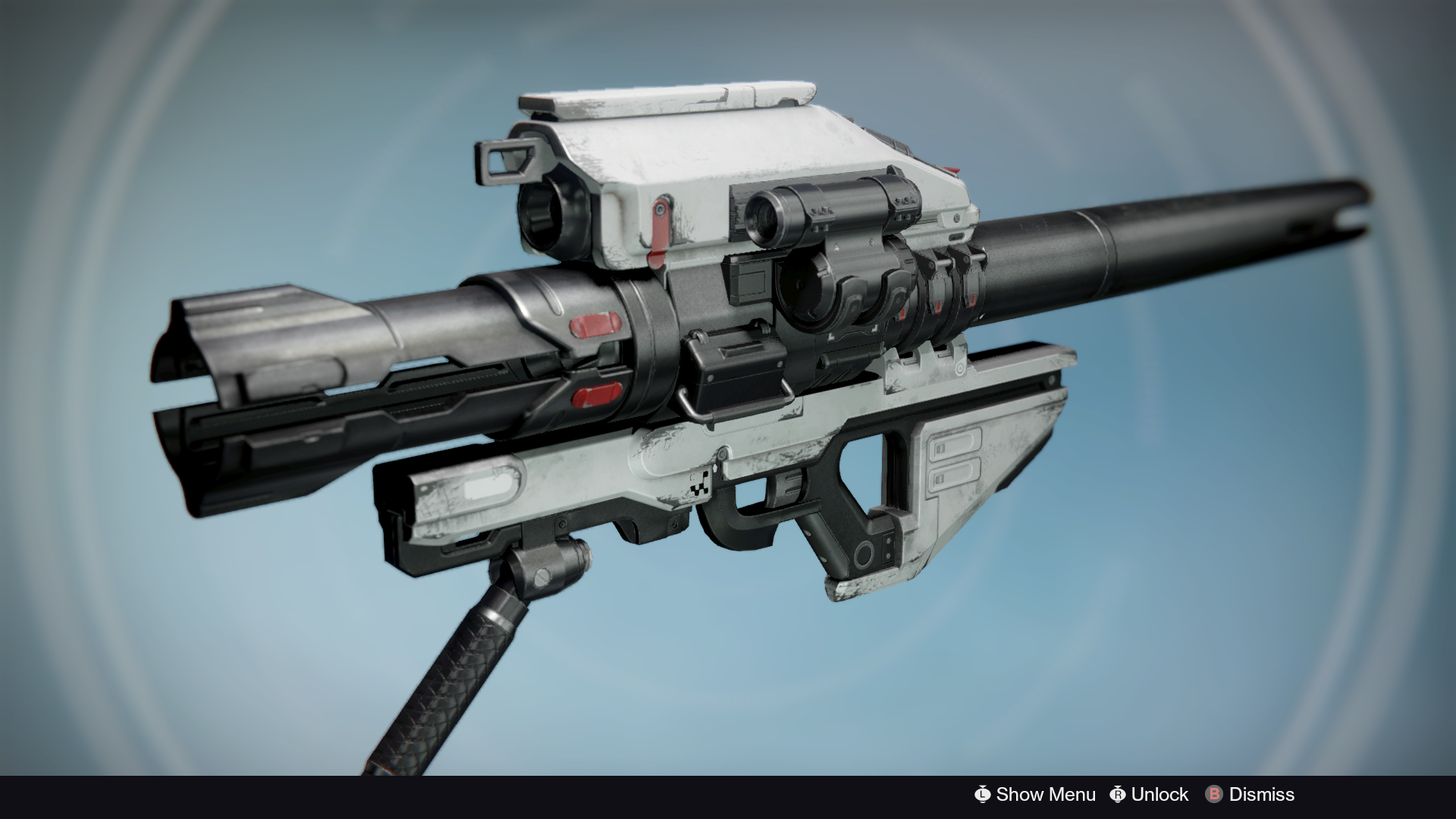 This image is a screenshot of a weapon from the Destiny series of first-person shooter video games developed by Bungie Studios and published by Bungie or Activision. It falls under the screenshot category for a copyrighted computer game or video game, and the copyright for it is most likely held by the company that developed the game. It is believed that the use of a limited number of web-resolution screenshots:
