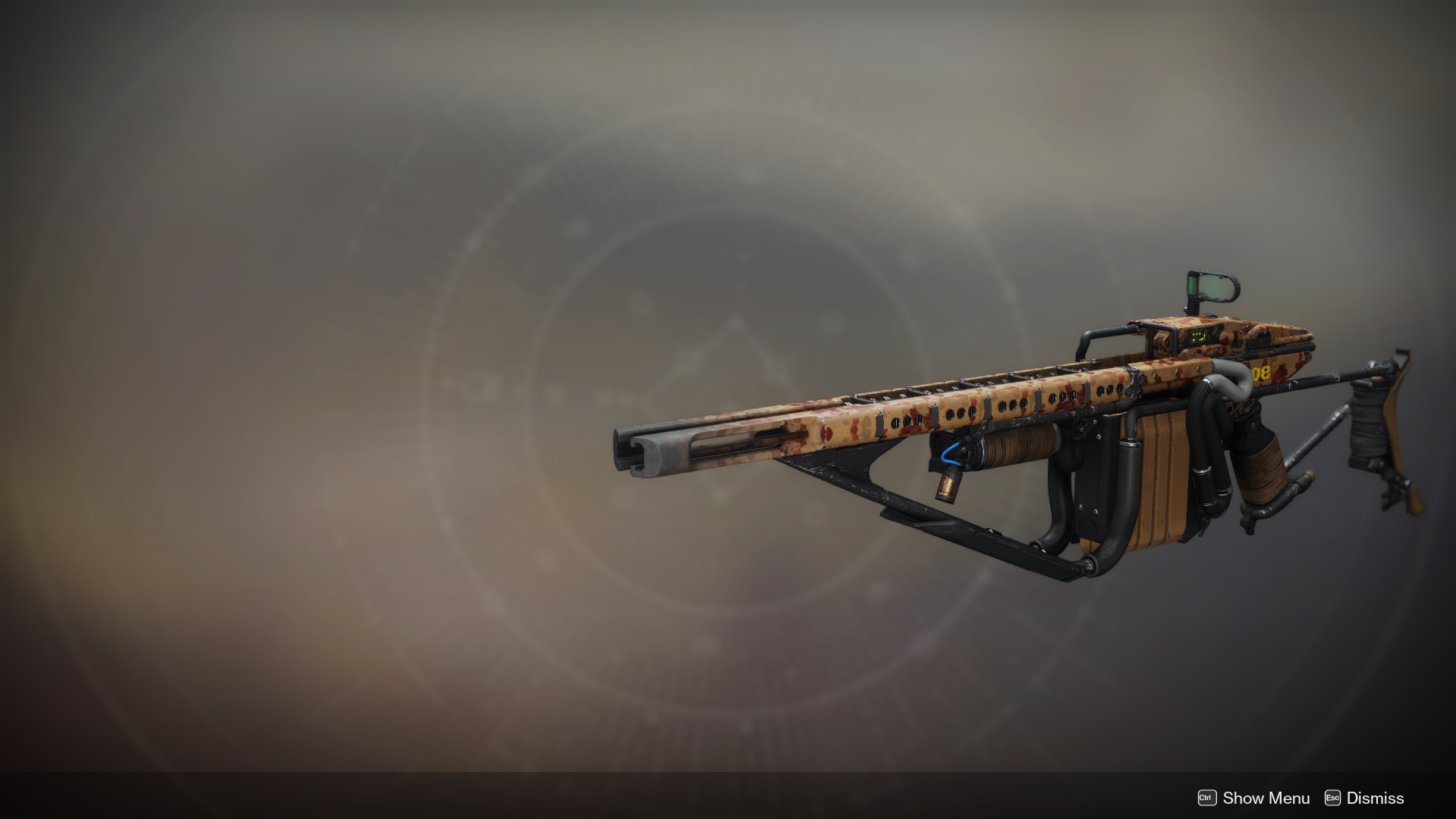 This image is a screenshot of a weapon from the Destiny series of first-person shooter video games developed by Bungie Studios and published by Bungie or Activision. It falls under the screenshot category for a copyrighted computer game or video game, and the copyright for it is most likely held by the company that developed the game. It is believed that the use of a limited number of web-resolution screenshots: