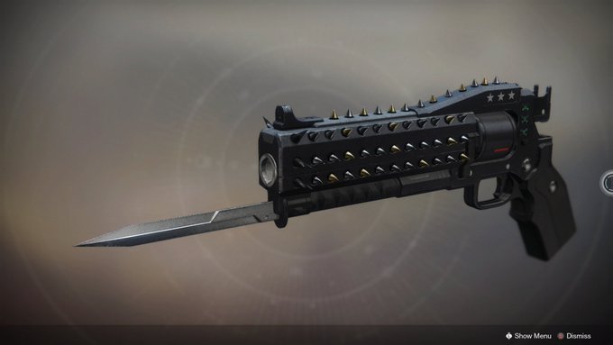 This image is a screenshot of a weapon from the Destiny series of first-person shooter video games developed by Bungie Studios and published by Bungie or Activision. It falls under the screenshot category for a copyrighted computer game or video game, and the copyright for it is most likely held by the company that developed the game. It is believed that the use of a limited number of web-resolution screenshots:
