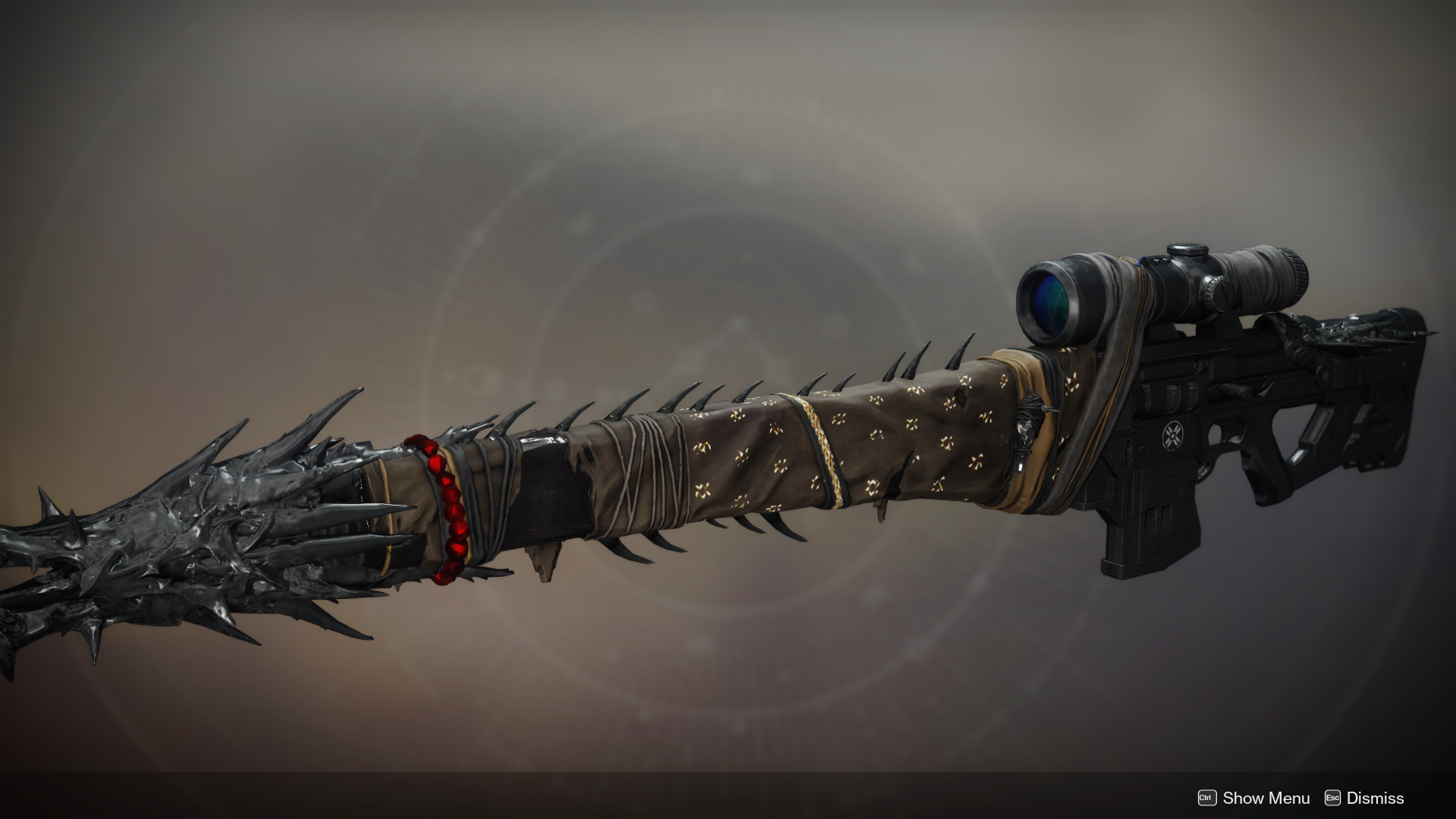 This image is a screenshot of a weapon from the Destiny series of first-person shooter video games developed by Bungie Studios and published by Bungie or Activision. It falls under the screenshot category for a copyrighted computer game or video game, and the copyright for it is most likely held by the company that developed the game. It is believed that the use of a limited number of web-resolution screenshots: