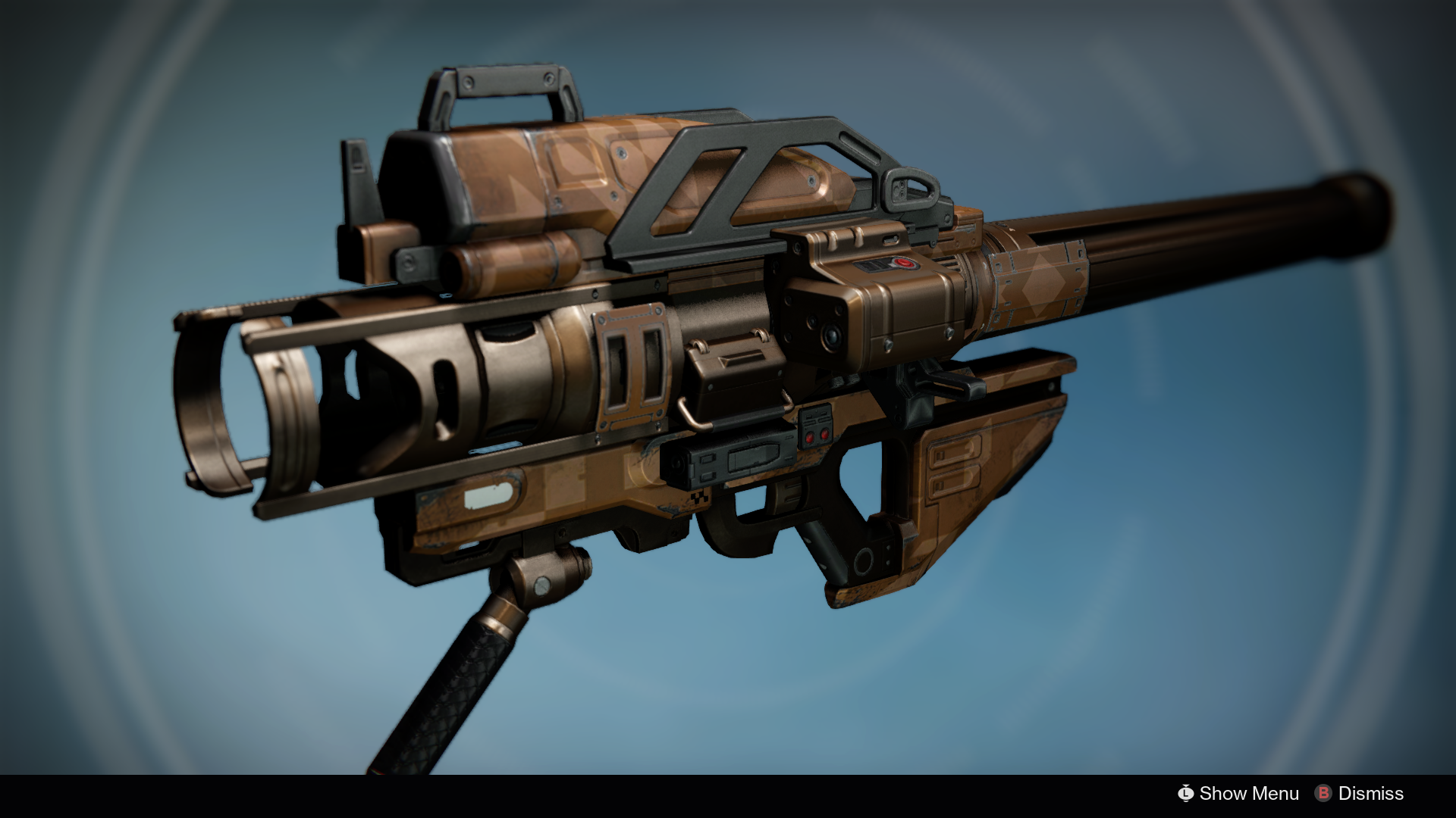 This image is a screenshot of a weapon from the Destiny series of first-person shooter video games developed by Bungie Studios and published by Bungie or Activision. It falls under the screenshot category for a copyrighted computer game or video game, and the copyright for it is most likely held by the company that developed the game. It is believed that the use of a limited number of web-resolution screenshots: