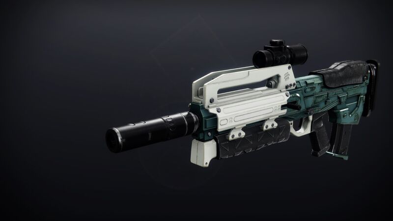 This image is a screenshot of a weapon from the Destiny series of first-person shooter video games developed by Bungie Studios and published by Bungie or Activision. It falls under the screenshot category for a copyrighted computer game or video game, and the copyright for it is most likely held by the company that developed the game. It is believed that the use of a limited number of web-resolution screenshots: