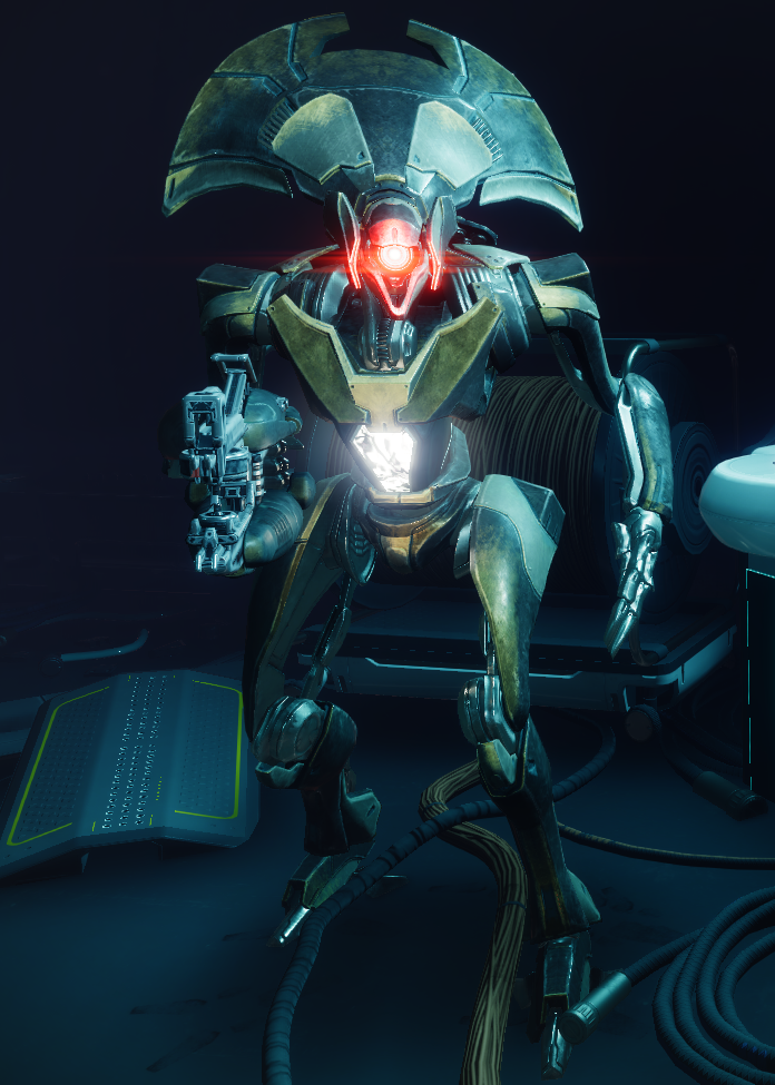 This image is a screenshot of a character or AI unit from the Destiny series of first-person shooter video games developed by Bungie Studios and published by Bungie or Activision. It falls under the screenshot category for a copyrighted computer game or video game, and the copyright for it is most likely held by the company that developed the game. It is believed that the use of a limited number of web-resolution screenshots:
