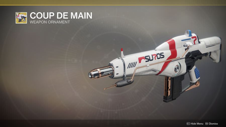 This image is a screenshot of a weapon from the Destiny series of first-person shooter video games developed by Bungie Studios and published by Bungie or Activision. It falls under the screenshot category for a copyrighted computer game or video game, and the copyright for it is most likely held by the company that developed the game. It is believed that the use of a limited number of web-resolution screenshots: