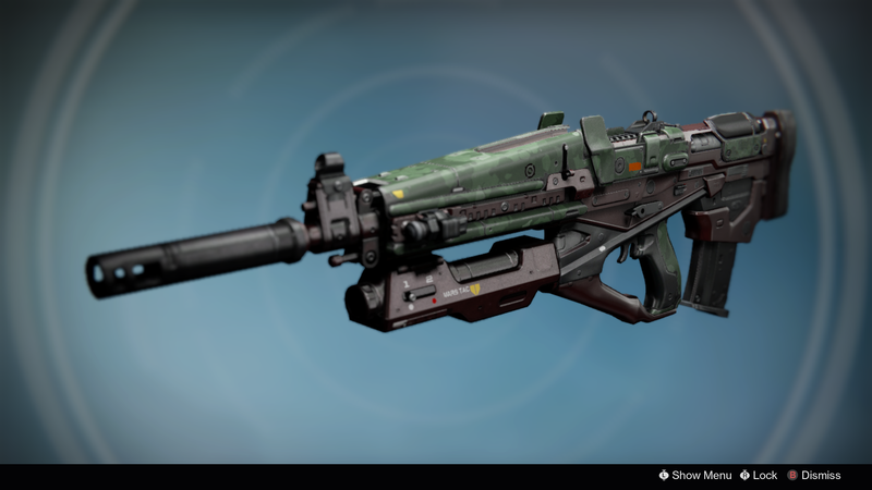 This image is a screenshot of a weapon from the Destiny series of first-person shooter video games developed by Bungie Studios and published by Bungie or Activision. It falls under the screenshot category for a copyrighted computer game or video game, and the copyright for it is most likely held by the company that developed the game. It is believed that the use of a limited number of web-resolution screenshots: