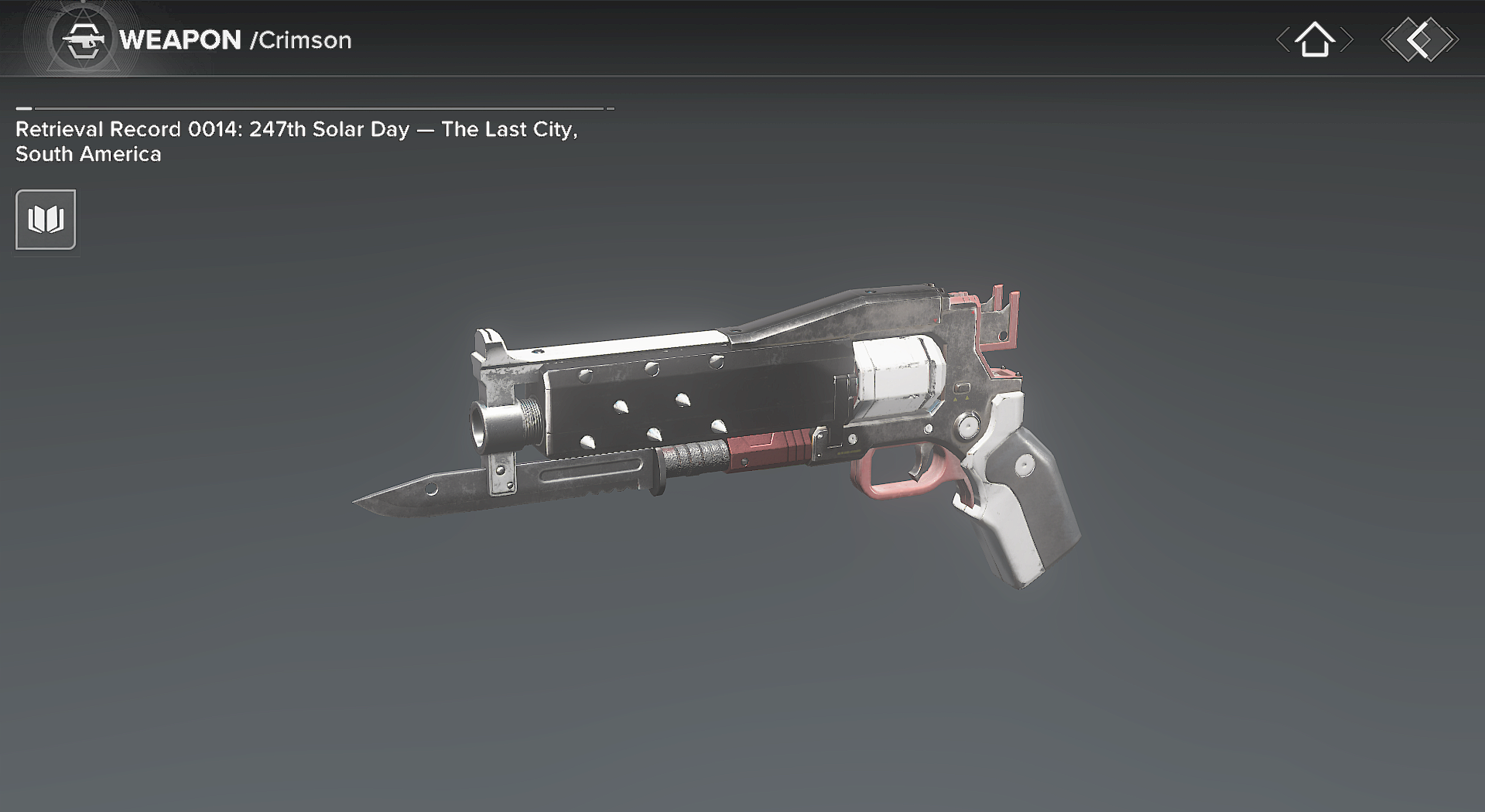This image is a screenshot of a weapon from the Destiny series of first-person shooter video games developed by Bungie Studios and published by Bungie or Activision. It falls under the screenshot category for a copyrighted computer game or video game, and the copyright for it is most likely held by the company that developed the game. It is believed that the use of a limited number of web-resolution screenshots: