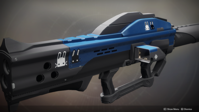 This image is a screenshot of a weapon from the Destiny series of first-person shooter video games developed by Bungie Studios and published by Bungie or Activision. It falls under the screenshot category for a copyrighted computer game or video game, and the copyright for it is most likely held by the company that developed the game. It is believed that the use of a limited number of web-resolution screenshots: