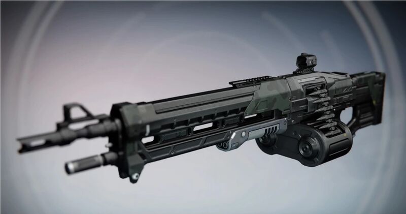 This image is a screenshot of a weapon from the Destiny series of first-person shooter video games developed by Bungie Studios and published by Bungie or Activision. It falls under the screenshot category for a copyrighted computer game or video game, and the copyright for it is most likely held by the company that developed the game. It is believed that the use of a limited number of web-resolution screenshots: