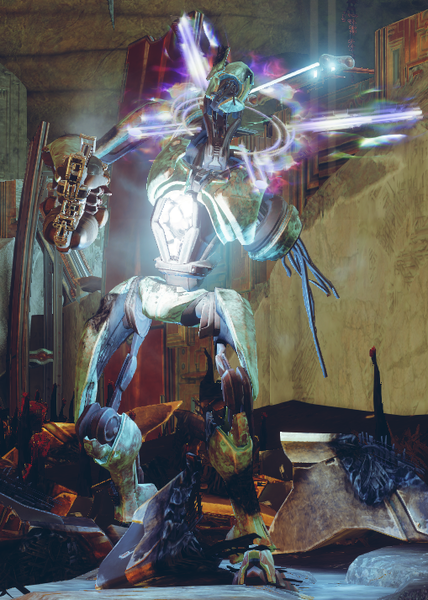 This image is a screenshot of a character or AI unit from the Destiny series of first-person shooter video games developed by Bungie Studios and published by Bungie or Activision. It falls under the screenshot category for a copyrighted computer game or video game, and the copyright for it is most likely held by the company that developed the game. It is believed that the use of a limited number of web-resolution screenshots: