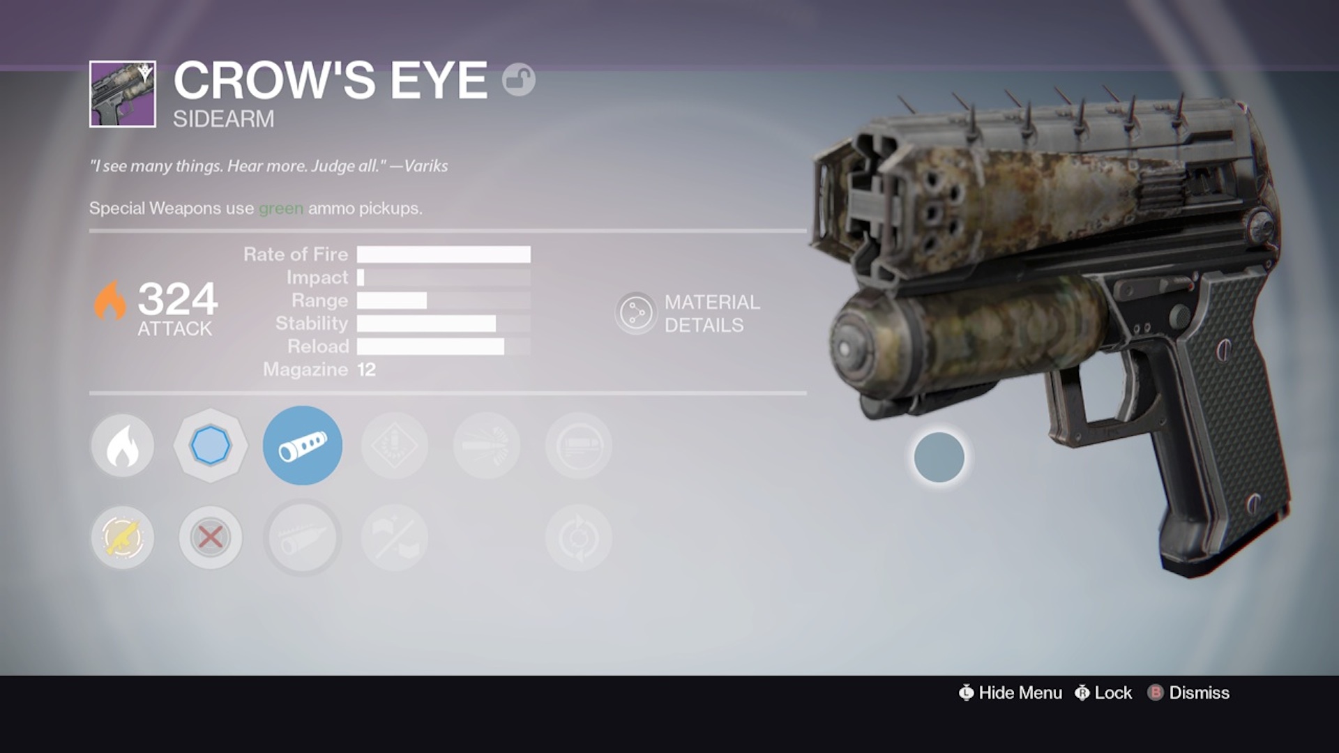 This image is a screenshot of a weapon from the Destiny series of first-person shooter video games developed by Bungie Studios and published by Bungie or Activision. It falls under the screenshot category for a copyrighted computer game or video game, and the copyright for it is most likely held by the company that developed the game. It is believed that the use of a limited number of web-resolution screenshots: