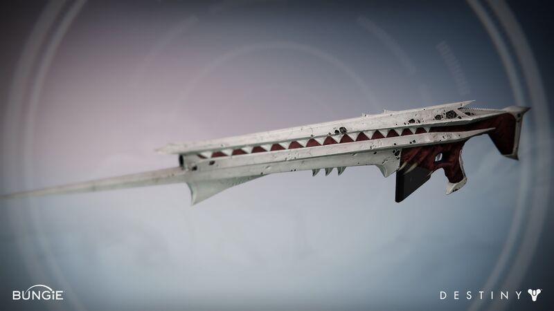 This image is a screenshot of a weapon from the Destiny series of first-person shooter video games developed by Bungie Studios and published by Bungie or Activision. It falls under the screenshot category for a copyrighted computer game or video game, and the copyright for it is most likely held by the company that developed the game. It is believed that the use of a limited number of web-resolution screenshots: