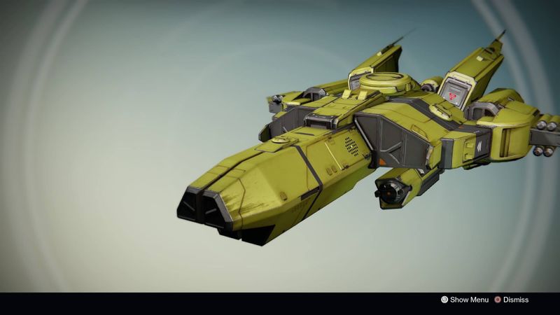 This image is a screenshot of a vehicle from the Destiny series of first-person shooter video games developed by Bungie Studios and published by Bungie or Activision. It falls under the screenshot category for a copyrighted computer game or video game, and the copyright for it is most likely held by the company that developed the game. It is believed that the use of a limited number of web-resolution screenshots: