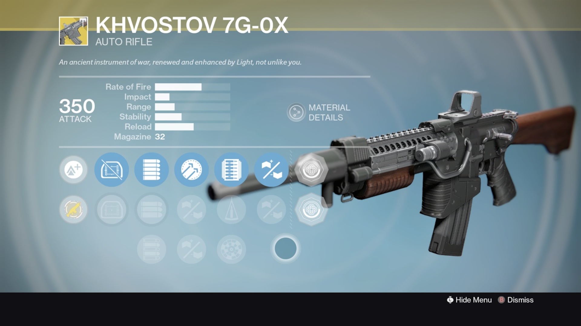In-game image of the Exotic Khvostov 7G-0X Auto Rifle's fully-customizable perks tree.