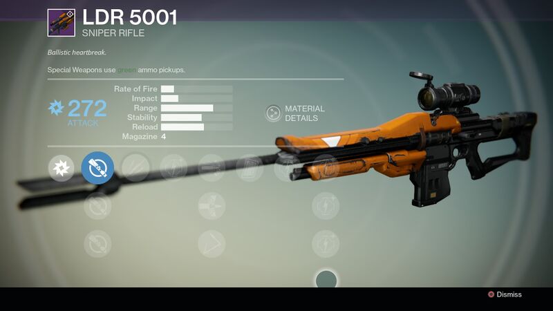 This image is a screenshot of a weapon from the Destiny series of first-person shooter video games developed by Bungie Studios and published by Bungie or Activision. It falls under the screenshot category for a copyrighted computer game or video game, and the copyright for it is most likely held by the company that developed the game. It is believed that the use of a limited number of web-resolution screenshots: