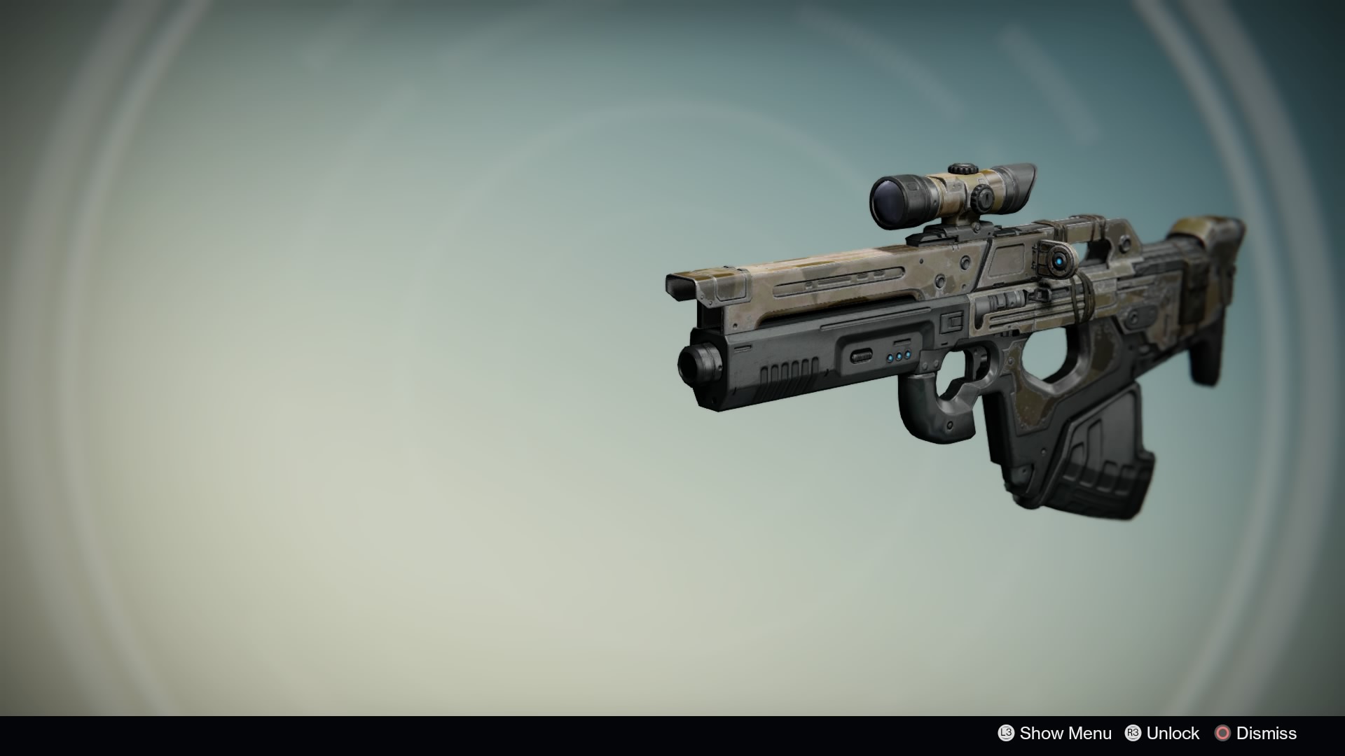 This image is a screenshot of a weapon from the Destiny series of first-person shooter video games developed by Bungie Studios and published by Bungie or Activision. It falls under the screenshot category for a copyrighted computer game or video game, and the copyright for it is most likely held by the company that developed the game. It is believed that the use of a limited number of web-resolution screenshots: