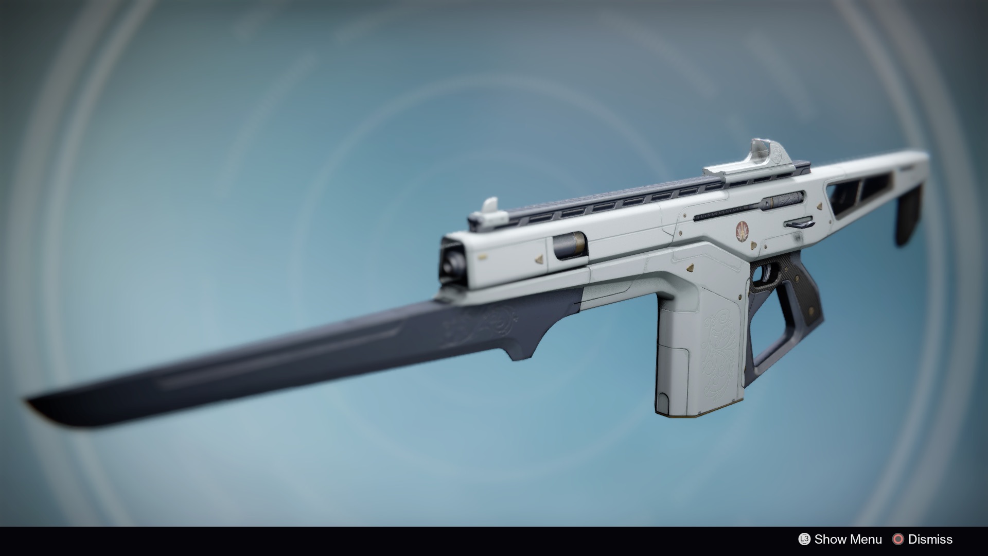 This image is a screenshot of a weapon from the Destiny series of first-person shooter video games developed by Bungie Studios and published by Bungie or Activision. It falls under the screenshot category for a copyrighted computer game or video game, and the copyright for it is most likely held by the company that developed the game. It is believed that the use of a limited number of web-resolution screenshots: