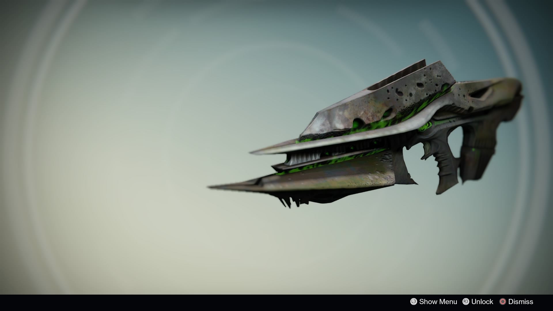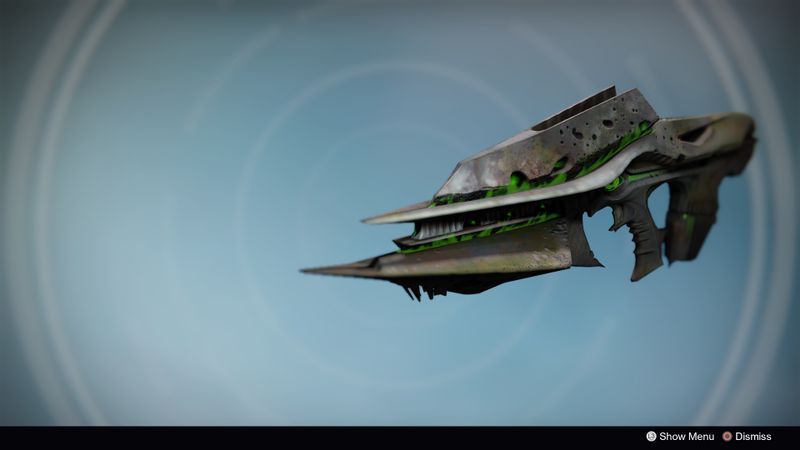 This image is a screenshot of a weapon from the Destiny series of first-person shooter video games developed by Bungie Studios and published by Bungie or Activision. It falls under the screenshot category for a copyrighted computer game or video game, and the copyright for it is most likely held by the company that developed the game. It is believed that the use of a limited number of web-resolution screenshots: