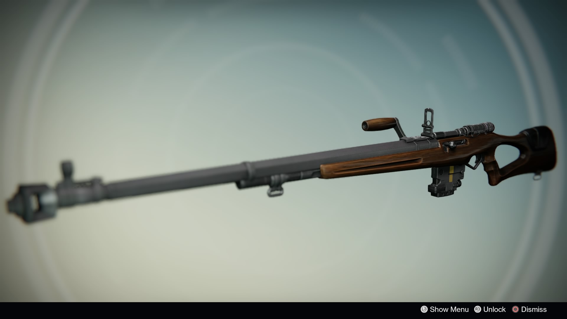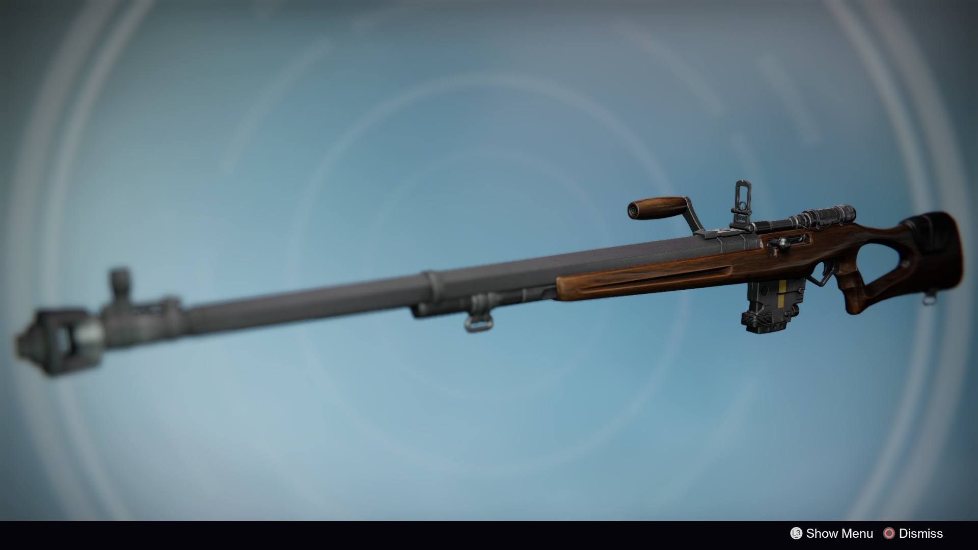 This image is a screenshot of a weapon from the Destiny series of first-person shooter video games developed by Bungie Studios and published by Bungie or Activision. It falls under the screenshot category for a copyrighted computer game or video game, and the copyright for it is most likely held by the company that developed the game. It is believed that the use of a limited number of web-resolution screenshots:
