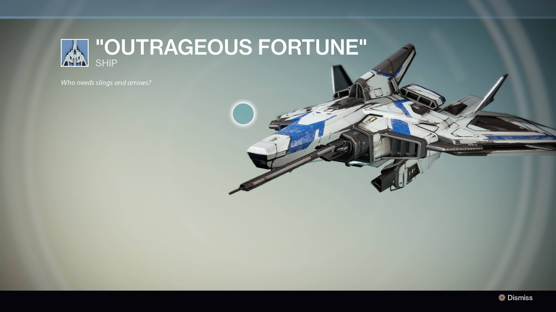 This image is a screenshot of a vehicle from the Destiny series of first-person shooter video games developed by Bungie Studios and published by Bungie or Activision. It falls under the screenshot category for a copyrighted computer game or video game, and the copyright for it is most likely held by the company that developed the game. It is believed that the use of a limited number of web-resolution screenshots:
