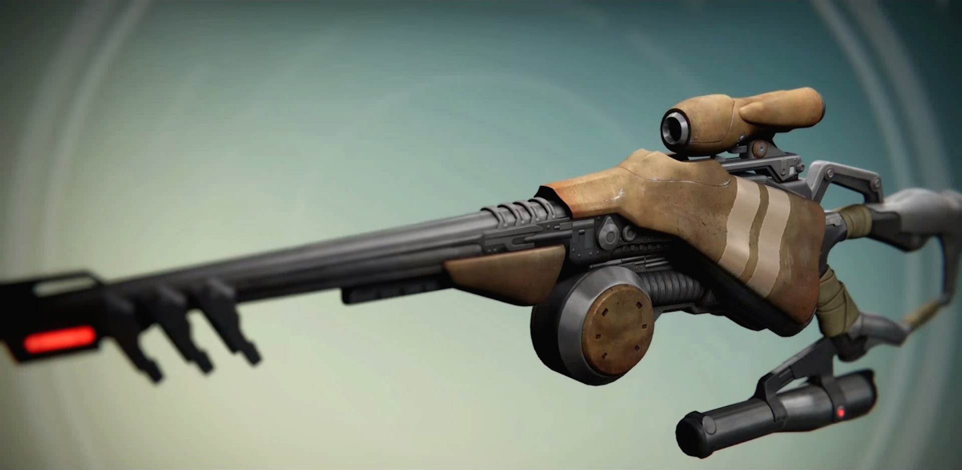 This image is a screenshot of a weapon from the Destiny series of first-person shooter video games developed by Bungie Studios and published by Bungie or Activision. It falls under the screenshot category for a copyrighted computer game or video game, and the copyright for it is most likely held by the company that developed the game. It is believed that the use of a limited number of web-resolution screenshots:
