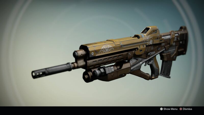 This image is a screenshot of a weapon from the Destiny series of first-person shooter video games developed by Bungie Studios and published by Bungie or Activision. It falls under the screenshot category for a copyrighted computer game or video game, and the copyright for it is most likely held by the company that developed the game. It is believed that the use of a limited number of web-resolution screenshots: