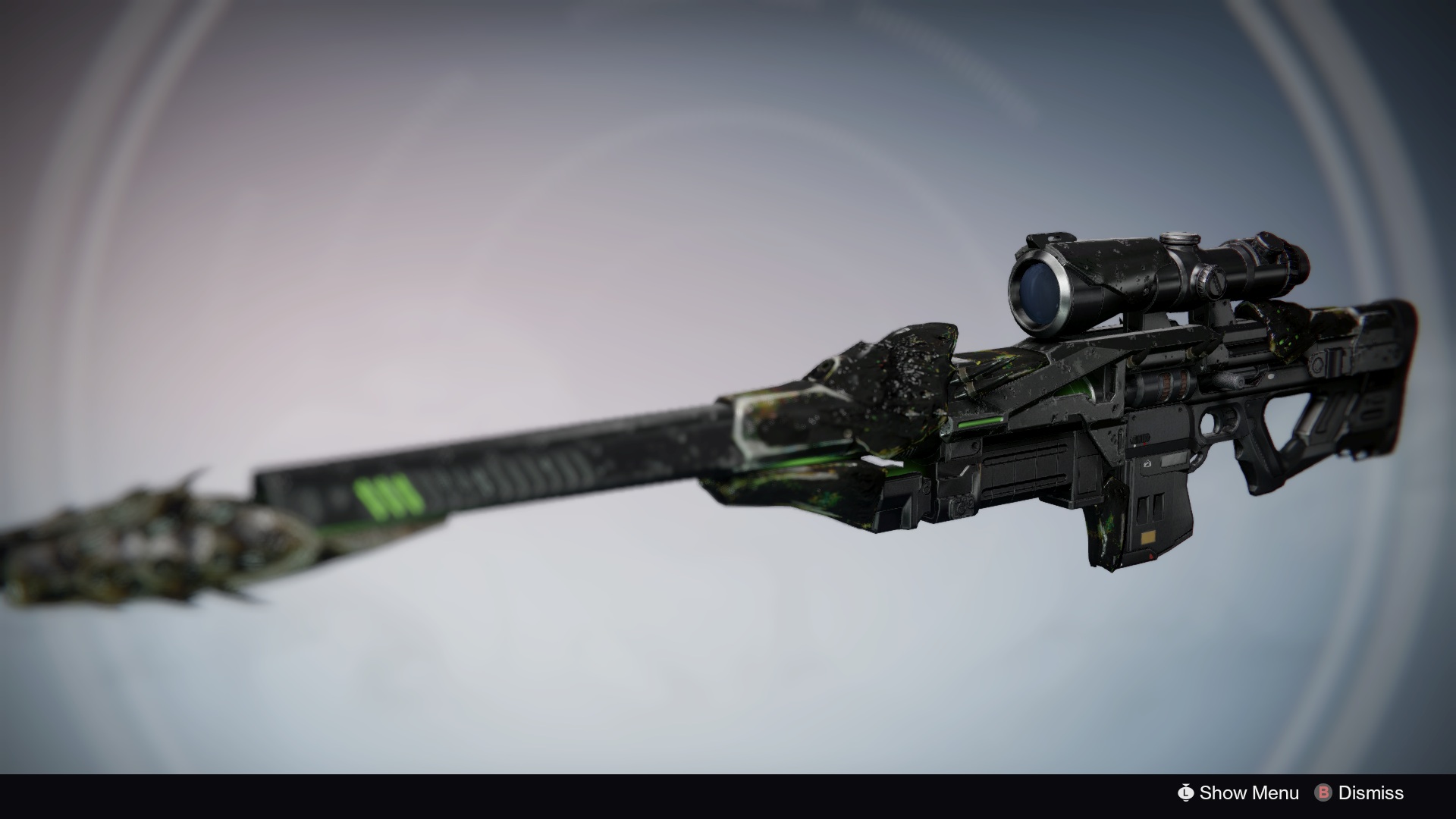 This image is a screenshot of a weapon from the Destiny series of first-person shooter video games developed by Bungie Studios and published by Bungie or Activision. It falls under the screenshot category for a copyrighted computer game or video game, and the copyright for it is most likely held by the company that developed the game. It is believed that the use of a limited number of web-resolution screenshots: