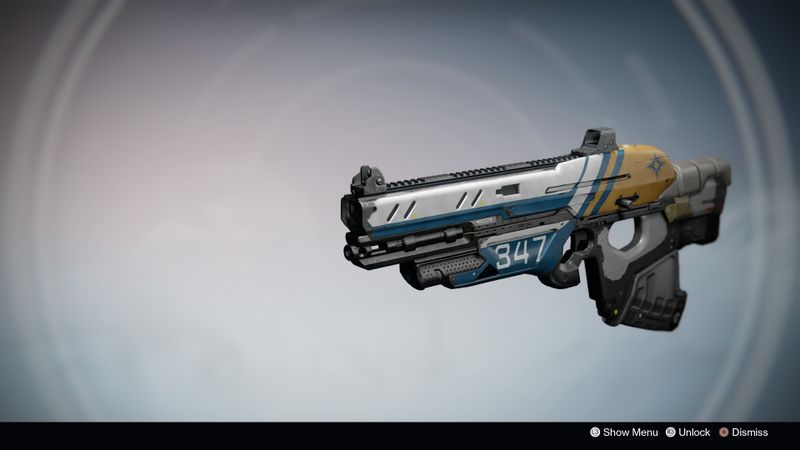 This image is a screenshot of a weapon from the Destiny series of first-person shooter video games developed by Bungie Studios and published by Bungie or Activision. It falls under the screenshot category for a copyrighted computer game or video game, and the copyright for it is most likely held by the company that developed the game. It is believed that the use of a limited number of web-resolution screenshots: