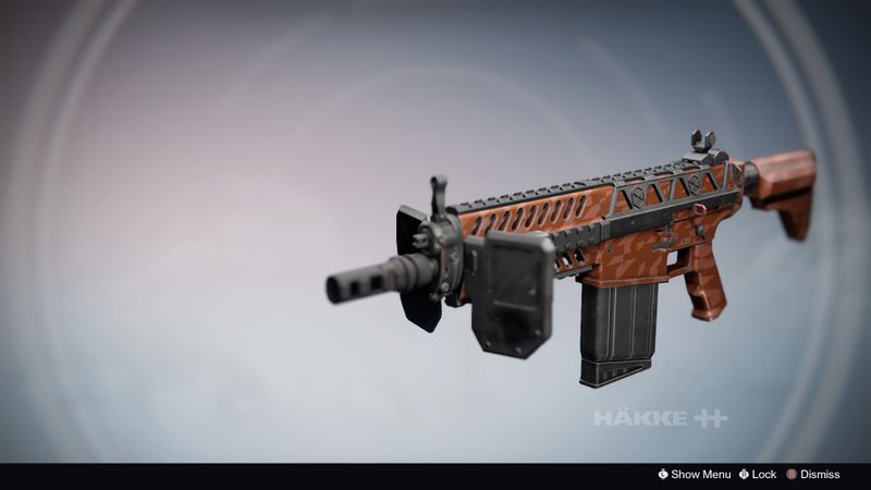 This image is a screenshot of a weapon from the Destiny series of first-person shooter video games developed by Bungie Studios and published by Bungie or Activision. It falls under the screenshot category for a copyrighted computer game or video game, and the copyright for it is most likely held by the company that developed the game. It is believed that the use of a limited number of web-resolution screenshots: