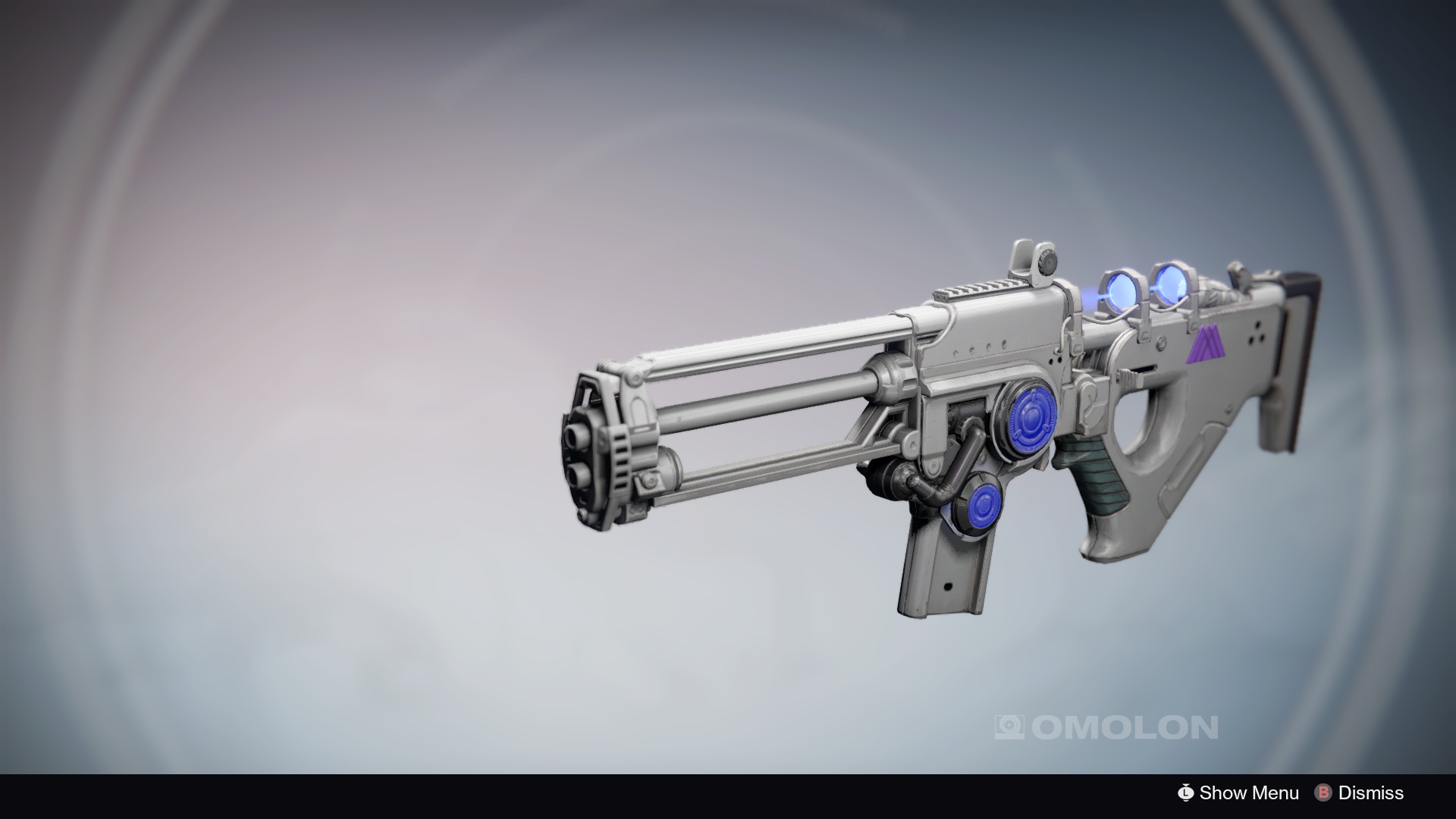 This image is a screenshot of a weapon from the Destiny series of first-person shooter video games developed by Bungie Studios and published by Bungie or Activision. It falls under the screenshot category for a copyrighted computer game or video game, and the copyright for it is most likely held by the company that developed the game. It is believed that the use of a limited number of web-resolution screenshots: