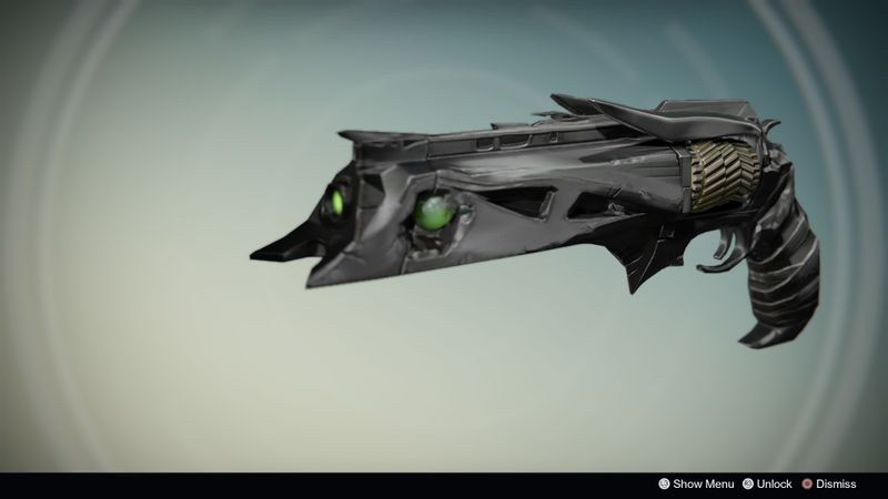 This image is a screenshot of a weapon from the Destiny series of first-person shooter video games developed by Bungie Studios and published by Bungie or Activision. It falls under the screenshot category for a copyrighted computer game or video game, and the copyright for it is most likely held by the company that developed the game. It is believed that the use of a limited number of web-resolution screenshots: