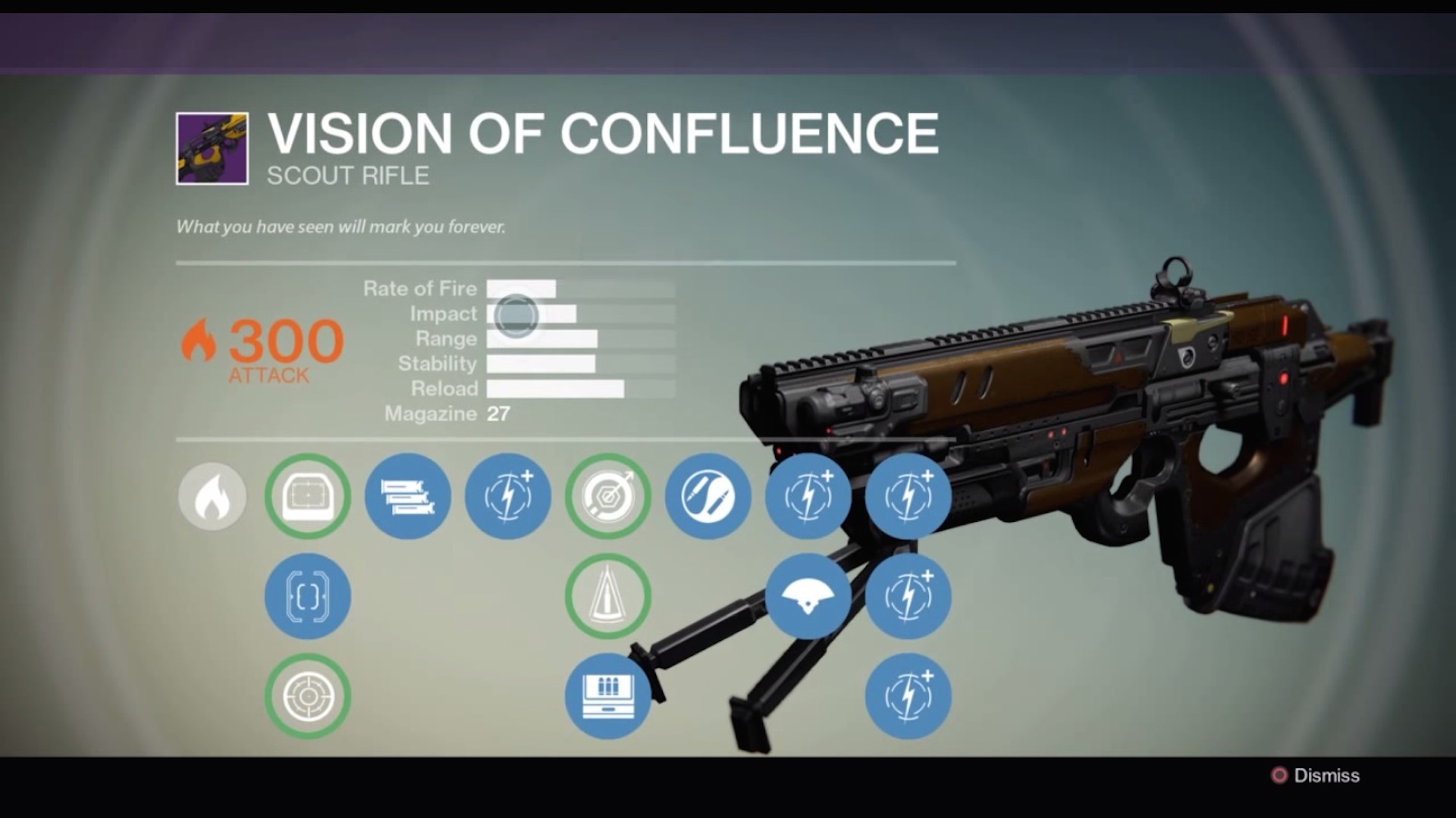 This image is a screenshot of a weapon from the Destiny series of first-person shooter video games developed by Bungie Studios and published by Bungie or Activision. It falls under the screenshot category for a copyrighted computer game or video game, and the copyright for it is most likely held by the company that developed the game. It is believed that the use of a limited number of web-resolution screenshots: