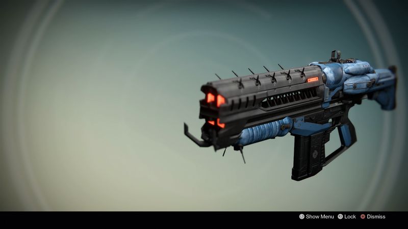 This image is a screenshot of a weapon from the Destiny series of first-person shooter video games developed by Bungie Studios and published by Bungie or Activision. It falls under the screenshot category for a copyrighted computer game or video game, and the copyright for it is most likely held by the company that developed the game. It is believed that the use of a limited number of web-resolution screenshots: