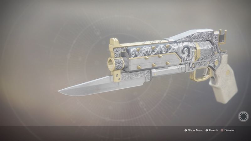 This image is a screenshot of a weapon from the Destiny series of first-person shooter video games developed by Bungie Studios and published by Bungie or Activision. It falls under the screenshot category for a copyrighted computer game or video game, and the copyright for it is most likely held by the company that developed the game. It is believed that the use of a limited number of web-resolution screenshots: