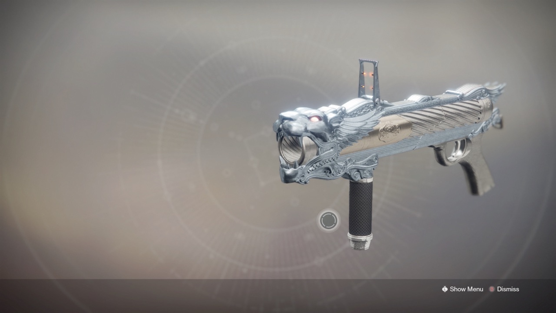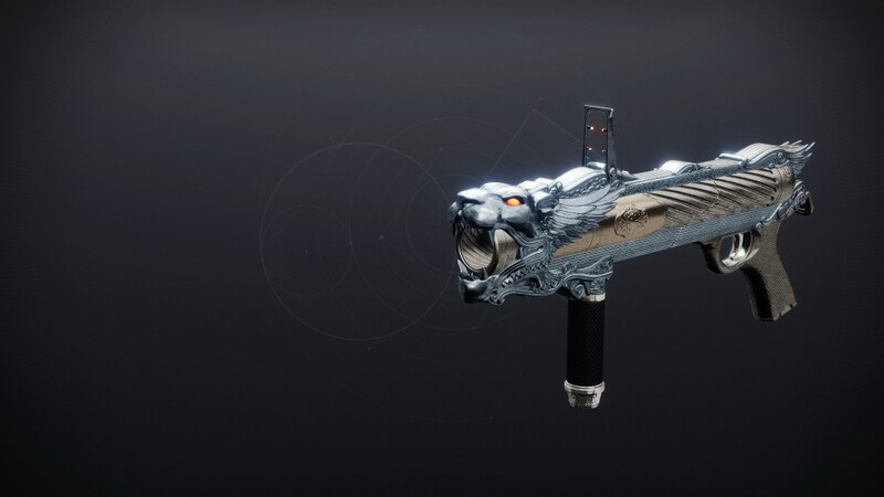 This image is a screenshot of a weapon from the Destiny series of first-person shooter video games developed by Bungie Studios and published by Bungie or Activision. It falls under the screenshot category for a copyrighted computer game or video game, and the copyright for it is most likely held by the company that developed the game. It is believed that the use of a limited number of web-resolution screenshots: