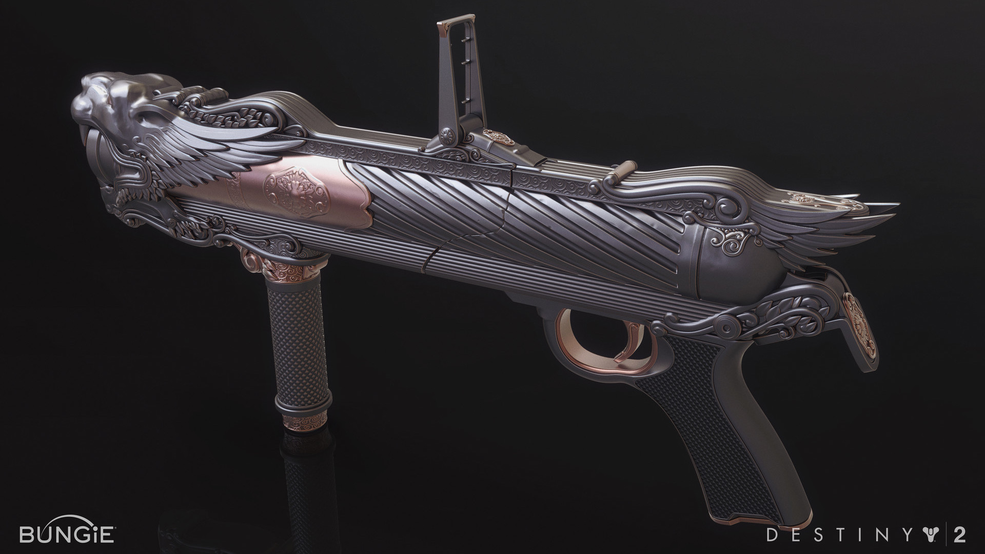 This image is a screenshot of a weapon from the Destiny series of first-person shooter video games developed by Bungie Studios and published by Bungie or Activision. It falls under the screenshot category for a copyrighted computer game or video game, and the copyright for it is most likely held by the company that developed the game. It is believed that the use of a limited number of web-resolution screenshots: