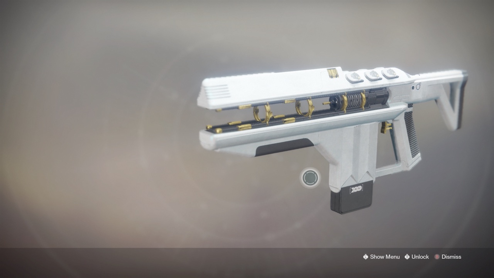 This image is a screenshot of a weapon from the Destiny series of first-person shooter video games developed by Bungie Studios and published by Bungie or Activision. It falls under the screenshot category for a copyrighted computer game or video game, and the copyright for it is most likely held by the company that developed the game. It is believed that the use of a limited number of web-resolution screenshots: