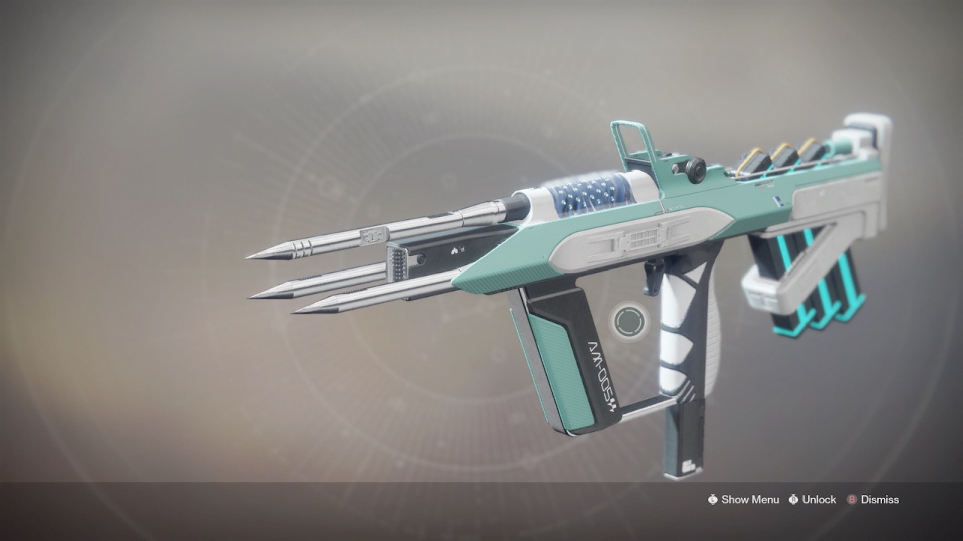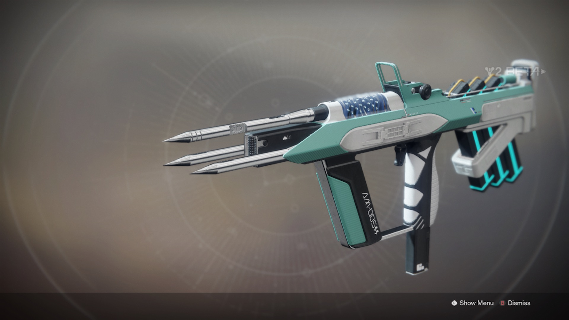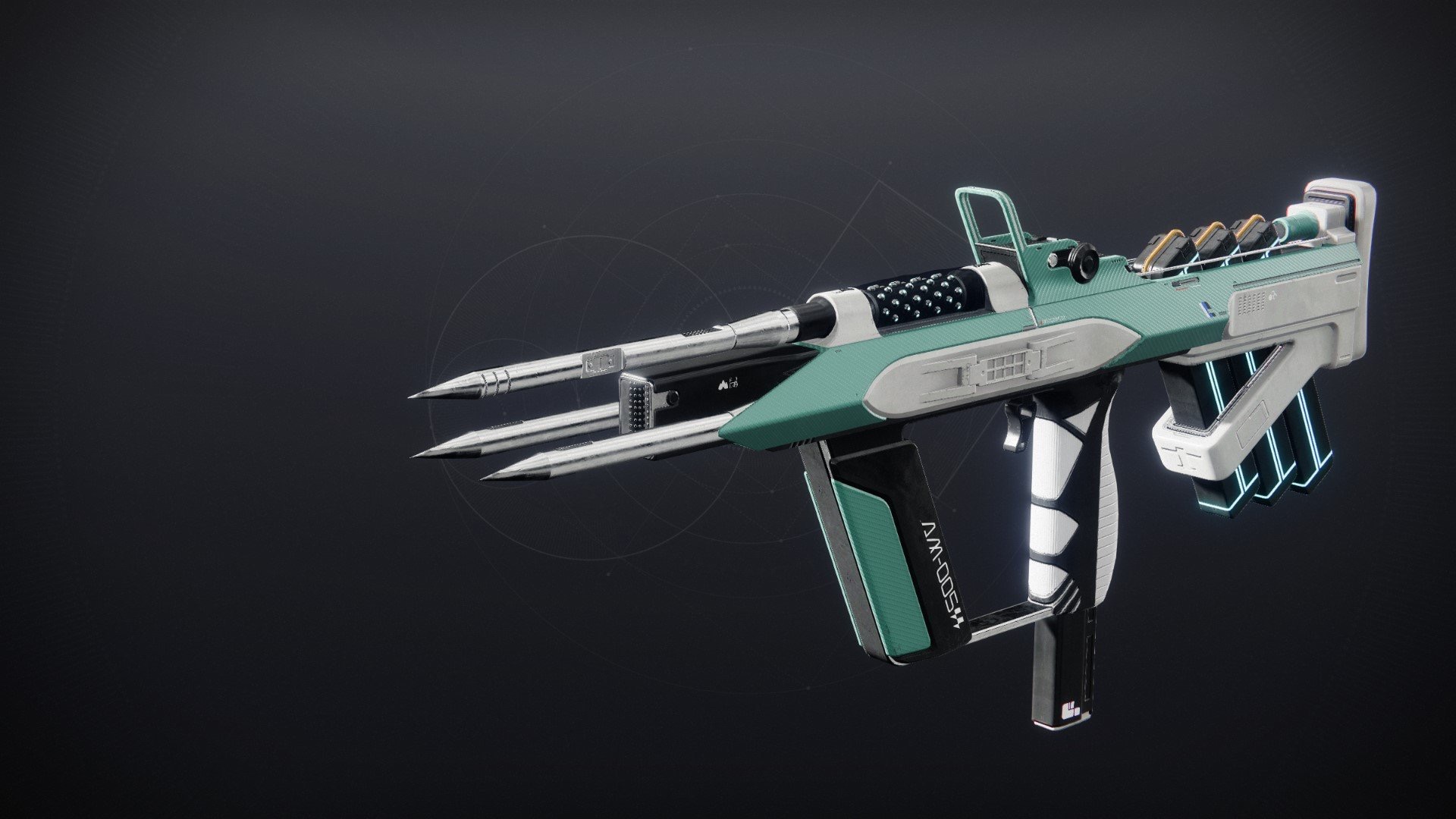 This image is a screenshot of a weapon from the Destiny series of first-person shooter video games developed by Bungie Studios and published by Bungie or Activision. It falls under the screenshot category for a copyrighted computer game or video game, and the copyright for it is most likely held by the company that developed the game. It is believed that the use of a limited number of web-resolution screenshots: