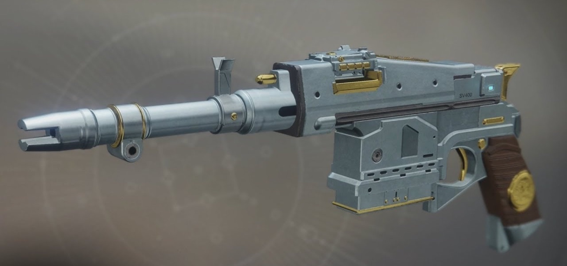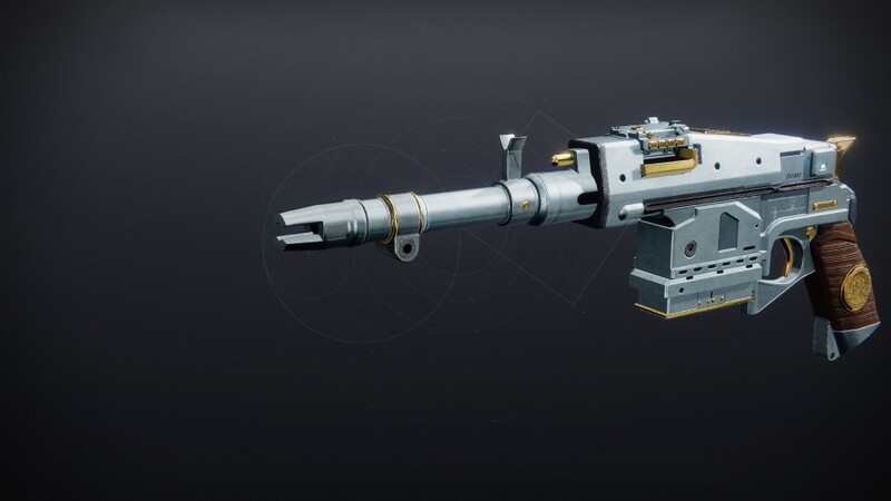 This image is a screenshot of a weapon from the Destiny series of first-person shooter video games developed by Bungie Studios and published by Bungie or Activision. It falls under the screenshot category for a copyrighted computer game or video game, and the copyright for it is most likely held by the company that developed the game. It is believed that the use of a limited number of web-resolution screenshots: